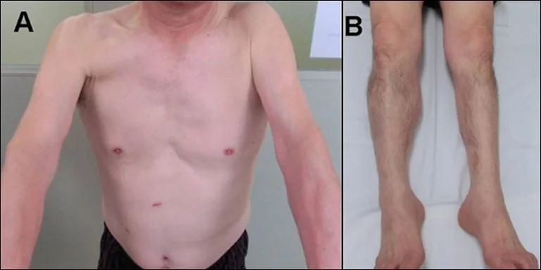 the left arm (A) and calf (B) is prominent. Photo Source.