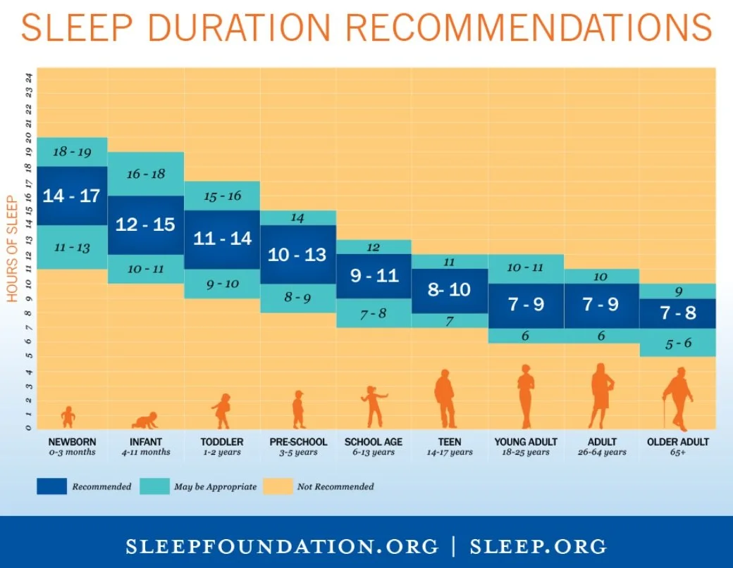 The Centers for Disease Control (CDC) reports that school-age children require at least 10 hours of sleep, teens need 9-10 hour sleep, and adults need 7-8 hours. These recommendations are similar to the national sleep foundation (see chart). Yet nearly 30% of adults reported average of less < six hours of sleep per day, and only 31% of high school students reported getting at least eight hours of sleep on the average school night. It is recognized that individual needs will vary, but the problem is most people believe that they are the exception. I thought about using an analogy with debt. I changed my mind when I saw an article about a report from the Pew Charitable Trust indicating that 80% of Americans are in debt with the median debt load being $67,900. (I mention this because it seems to be an indication that our society tends to focus on the here and now rather than the future). Instead, I will use an analogy between sleep and oil in our cars. If an individual purchases a new vehicle, there is usually an owner’s manual in the glove compartment which states the recommended number of quarts of oil to be used. If you can, imagine a friend purchasing a car and saying, “my car only needs half that amount of oil” and with the first oil change they use only half the quantity recommended. With modern engineering, the engine may start and sound as if it is working well, but anyone knows that at some point there will be a problem and the engine will either wear out early or seize up. Similarly, many people define the amount of sleep they need as being just over the amount of sleep that leads to dysfunction the next day. Most people seldom look at the long-term effect of sleep deprivation and how it can lead to “early wear” of our neurologic, cardiovascular, musculoskeletal, and immune systems.